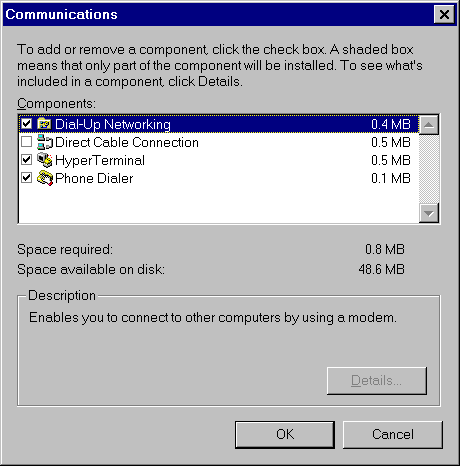 Click in the check-off box to select: 1) Dial-Up Networking; 2)