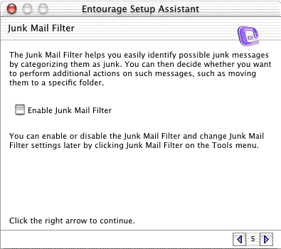 Step 2) In this screen you have the option of creating a Junk Mail Filter. Check the box if you would like to activate this filter. Click on the right arrow to move to the next screen.
