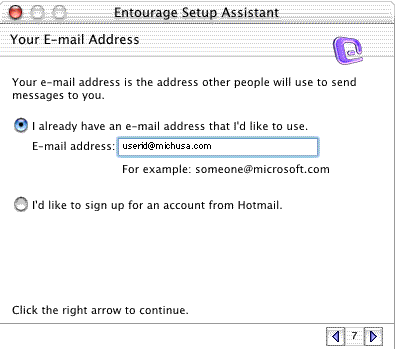 Step 1) If you have never used Entourage as your email program when you open the program and choose the Accounts option from the Tools menu you will see the Entourage Setup Assistant dialog. The first three screens pertain to personal information. We will begin the email setup on screen #4. Click to select the top choice in screen 4 then click on the right arrow key to advance to the next screen.