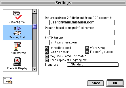 Step 5) This page contains options that do/do not have to be selected. It is up to your personal preferences.Check for Mail... is an option that will make Eudora check for new E-Mail messages every so often as set up by you. So if you check this option and put a 5 in the box, Eudora will check for new E-Mail every 5 minutes if Eudora is running. Skip messages over... is an option that will not download certain sized E-Mail messages. It is a good idea to leave this unchecked or you will never get E-Mail messages that have a large enough attachment or enough attachments to put the size of the message over the settings you put in the box. Leave on server... will leave messages on your E-Mail server for however many days you type in. The good part is that if you get a message at your home computer, but want to get it at work, you will be able to because it is still on the server. The down side is that this will tend to fill up your E-Mail space on your michusa.com server. Send on Check is good to have selected. This way if you have any messages in the queue, it will send them whenever you check to see if you have any new mail. Save Password will save your mail password to a file. This way, you will only have to type it in once when checking your E-Mail. Otherwise you will have to type it in every time you check to see if you have new messages. Delete from Server... should be checked if you have Leave on server... checked. When you delete a message it goes into a trash folder. When you delete the trash folder, it deletes the message from your hard drive, it also deletes the message off the server so that your E-Mail space does not get too full. The Authentication option should be set to the default Passwords. Everything else on this page should be left alone, it is set up by default to work with our server system. If you scroll down the left-hand window, you will see a Sending Mail option, click on it.