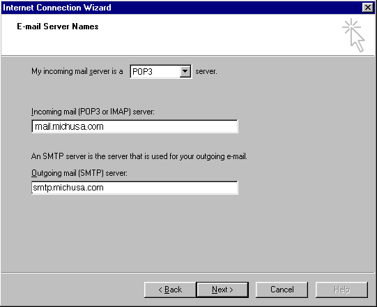 Step 3) Leave the incoming mail server name set to the POP3 selection. Type mail.michusa.com in the Incoming mail (POP3) or (IMAP) server field. Type smtp.michusa.com in the Outgoing mail (SMTP) server field.then click the Next button to continue the setup.
