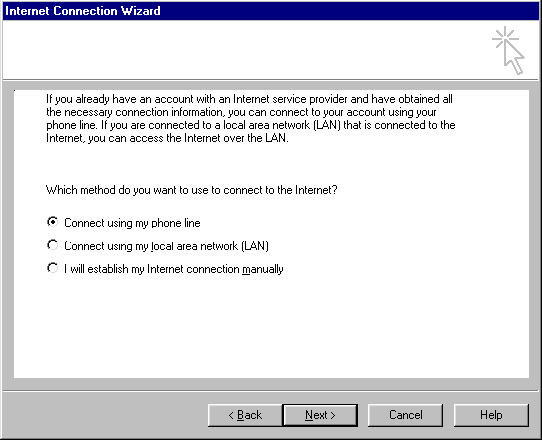 Step 5) If you are using a dial-up modem to connect to michusa.com, select the top selection (Connect using my phone line). If you have a dedicated account choose the middle selection (Connect using my local are network (LAN)). Click the Next button.