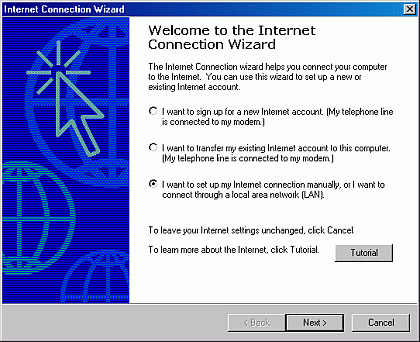 Step 2) This opens the Welcome to the Network Connection Wizard window, select the I want to set up my Internet Connection manually, or I want to connect through a local area Network (LAN) option then click the Next button to continue.