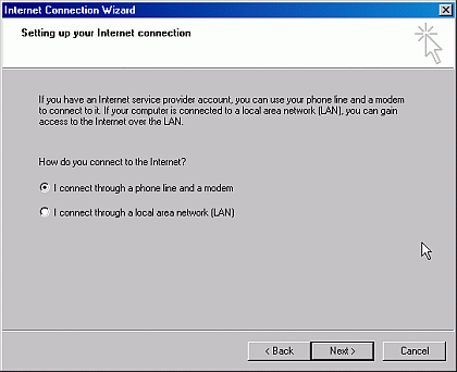 Step 3) Select the I connect through a phone line and a modem option and click the Next button to continue.