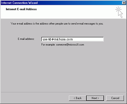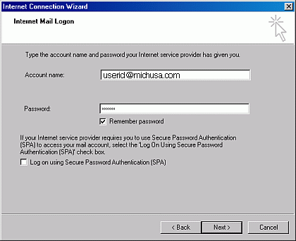 Step 12) In the Internet Mail Logon window type in your michusa.com email address in the Account Name field. Type in your password in the Password field. If the password box is greyed out then put a check in the Remember Password checkbox. Please check that the username you type in is not in the wrong capitalization because usernames and passwords are case sensitive. The password you type in shows up as a series or stars to keep it private. If you want to type in a password every time you check your email then leave the Remember Password box unchecked. Click the Next button to continue.