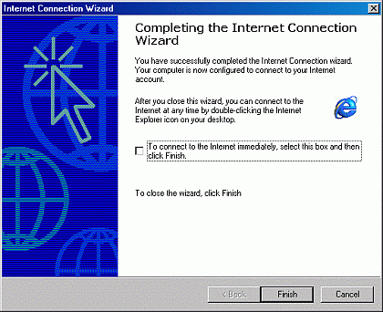 Step 13) Your setup is complete! Put a check in the box next to To connect to the Internet immediately, select this box and then click "Finish" button. If you don't want to connect to the Internet immediately then leave the box unchecked and click the "Finish" button. Your PC should now be all ready to connect to the Internet. To get online just double click onto the Internet Explorer icon on your Desktop to surf the Web. To check your email just double click onto the Outlook Express icon on the desktop.