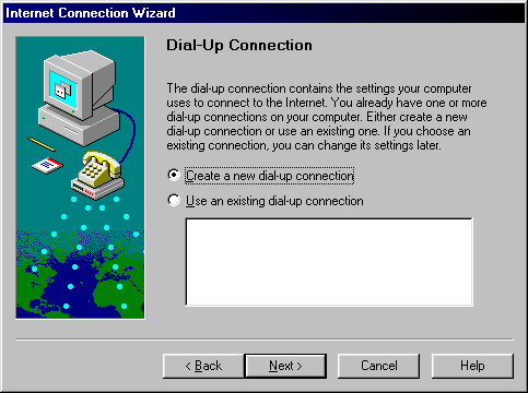 Step 3) Select the top radio button to create a new dial-up connection, then click the Next button to continue.